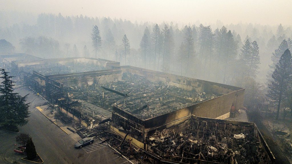 FILE – In this Thursday, Nov. 15, 2018 file photo smoke hangs over the scorched remains of Old Town Plaza following the wildfire in Paradise, Calif. Most homes are gone, as are hundreds of shops and other buildings. The supermarket, the hardware story, Dolly-O-Donuts & Gifts where locals sarted their day with a blueberry fritter and a quick bit of gossip, all gone. The town quite literally went up in smoke and flames in the deadliest, most destructive wildfire in California history. (AP Photo/Noah Berger, File)
