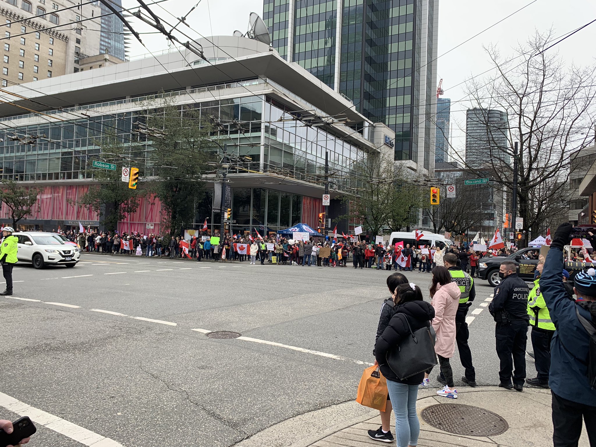 Saturday’s protest began in Langley and made way to Vancouver. The route passed Mount Saint Joseph Hospital on Kingsway, Vancouver General on Broadway, and St. Paul’s on Burrard Street. Some smaller contingents of the protest made their presence known on other routes, causing traffic concerns.